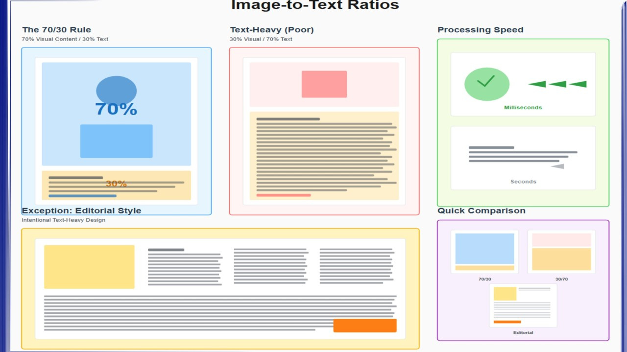 Sufficient Text Provides Context: 30% text allocation allows enough space for headline, value proposition, supporting detail, and clear call-to-action. Enough information to convert interest into action.