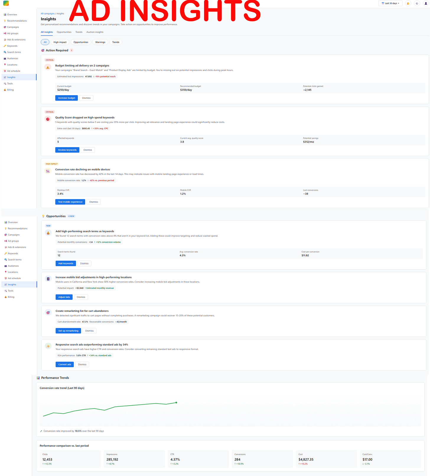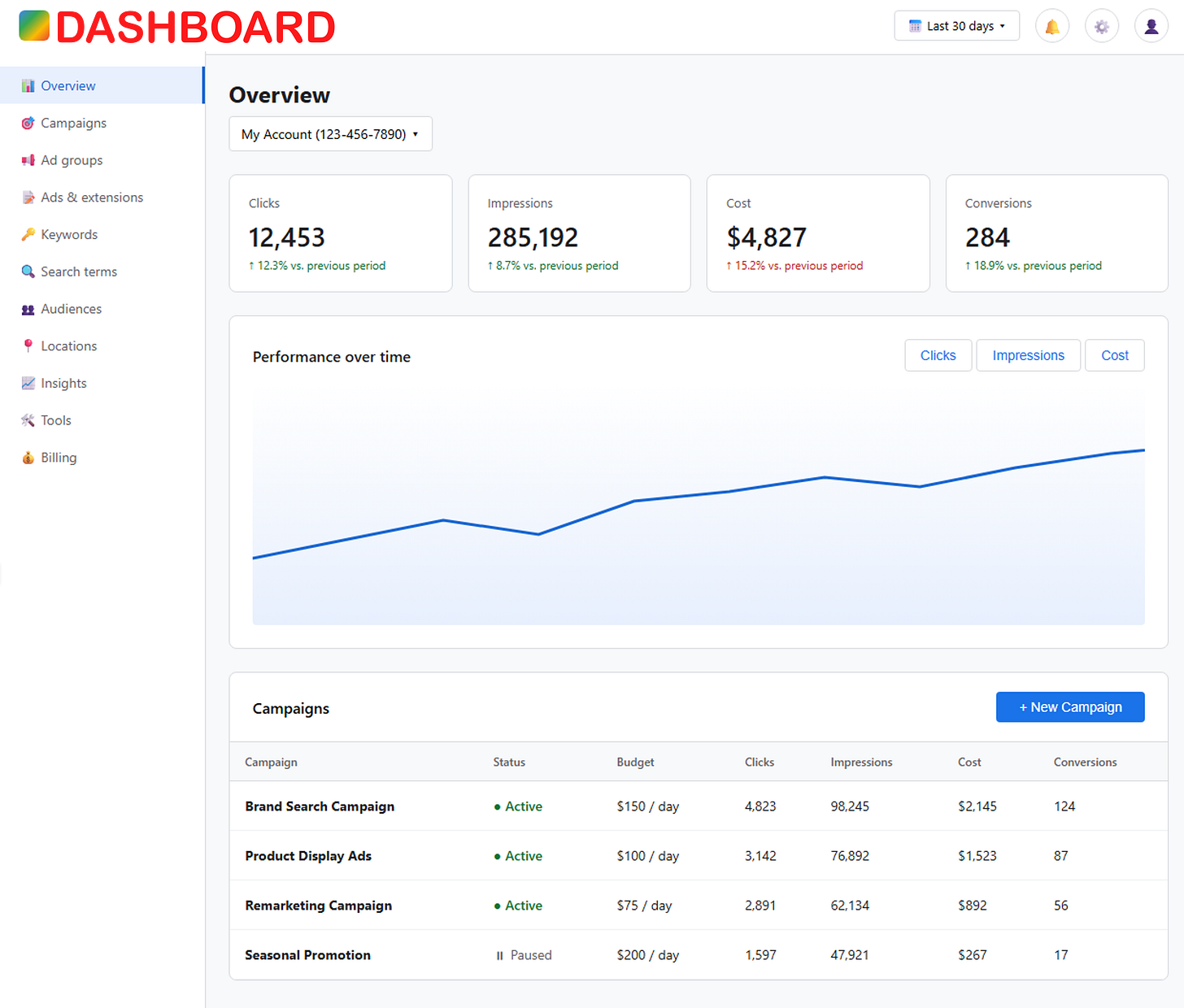 At the top of the dashboard, you’ll find four key performance indicators that provide an immediate snapshot of your account health. The Clicks metric (12,453) shows how many times users have actually engaged with your ads by clicking through, with a healthy 12.3% increase versus the previous period indicating growing engagement. Impressions (285,192) represent the total number of times your ads were displayed to users, showing an 8.7% increase and indicating expanding reach. The Cost metric ($4,827) is your total ad spend for the period, up 15.2%, which you’ll want to correlate with your conversion growth to ensure efficiency. Finally, Conversions (284) are your bottom-line results the actual desired actions taken, whether that’s purchases, sign-ups, or leads showing an impressive 18.9% increase. As a performance marketer, you should constantly monitor the relationship between these metrics: if cost increases faster than conversions, your efficiency is declining; if conversions grow faster than cost, you’re improving performance.