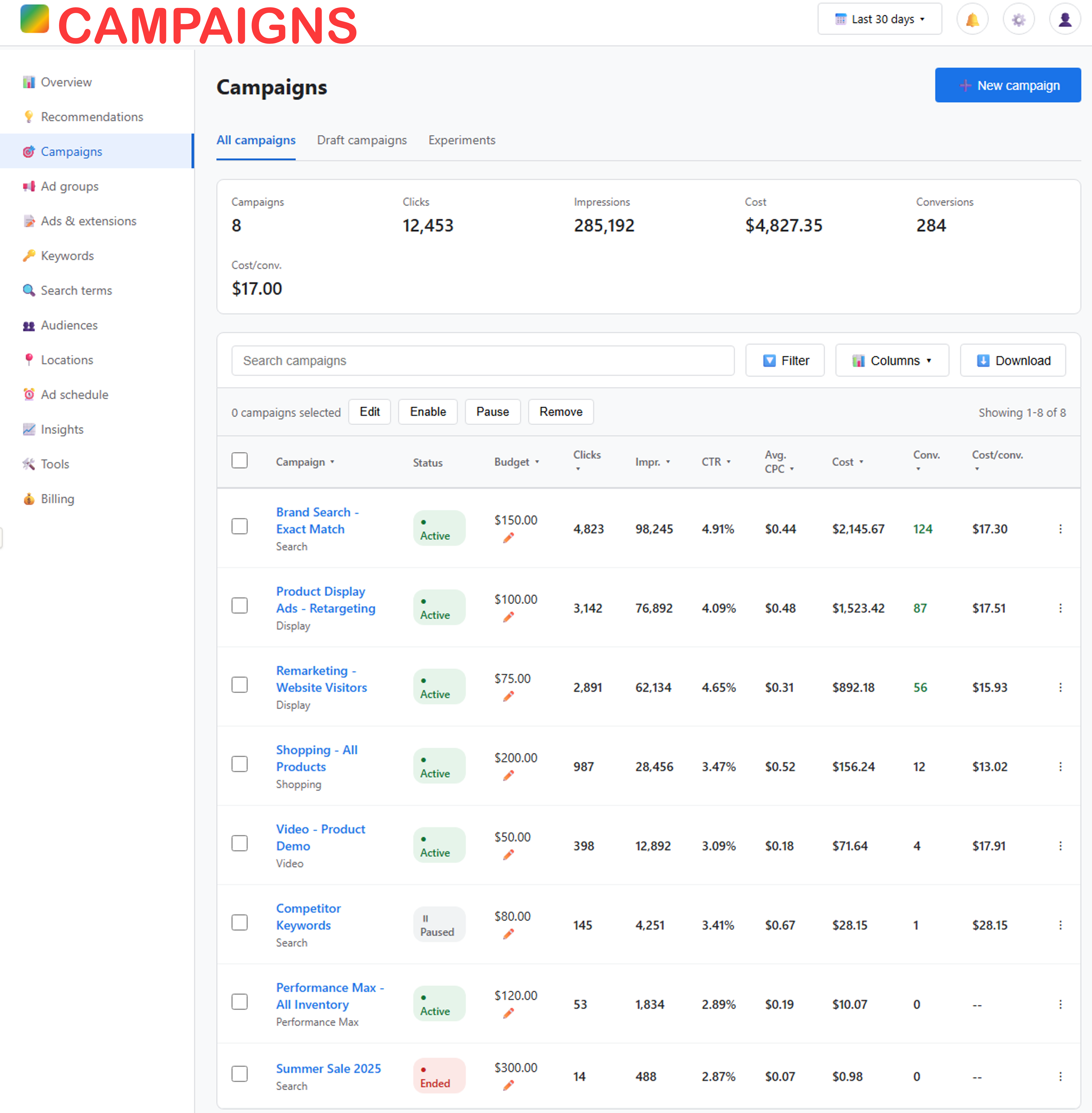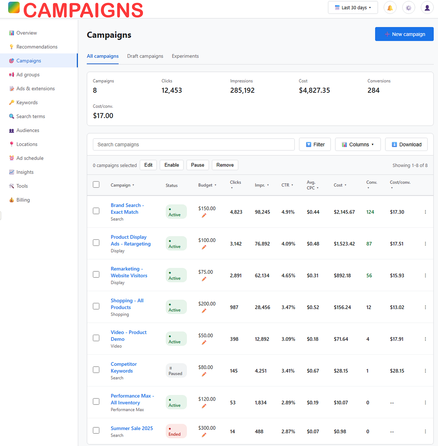 Using this dashboard effectively means making daily optimization decisions based on the data. You’d increase budgets on Remarketing and Brand Search campaigns that are efficient and scalable. You’d investigate and potentially pause the Performance Max campaign if it continues not converting. You’d test restarting Competitor Keywords with refined targeting or creative to improve that $28.15 CPA. You’d analyze why Shopping isn’t scaling despite good efficiency and potentially adjust product feed, bidding strategy, or targeting. You’d monitor the Video campaign until it reaches statistical significance before making budget decisions. The three-dot menu on the right of each row provides quick access to detailed settings, allowing you to drill into ad copy, keywords, audiences, and bidding strategies for each campaign. This campaigns view is where strategy meets execution, and mastering it means constantly balancing the tension between spending enough to generate results while maintaining the efficiency that drives profitable growth.