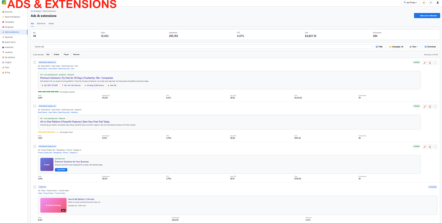 The Ads & Extensions view is where creative execution meets performance data this is the granular level where you can see exactly which ad variations are resonating with audiences and driving conversions. For a professional performance marketer, this view is essential for understanding message-market fit and continuously improving ad effectiveness through testing and optimization.