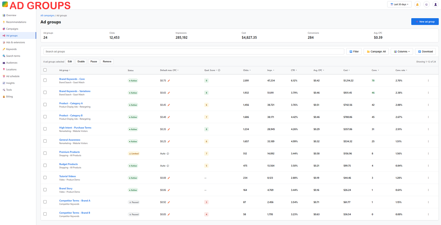 Ad groups sit between campaigns and individual keywords or audiences, allowing you to organize your advertising around specific themes, products, or customer segments. Each ad group contains related keywords or targeting criteria along with tailored ad creative that speaks directly to that audience’s intent. The 24 ad groups shown here represent different strategic bets across your various campaigns, each with its own performance profile and optimization opportunities.