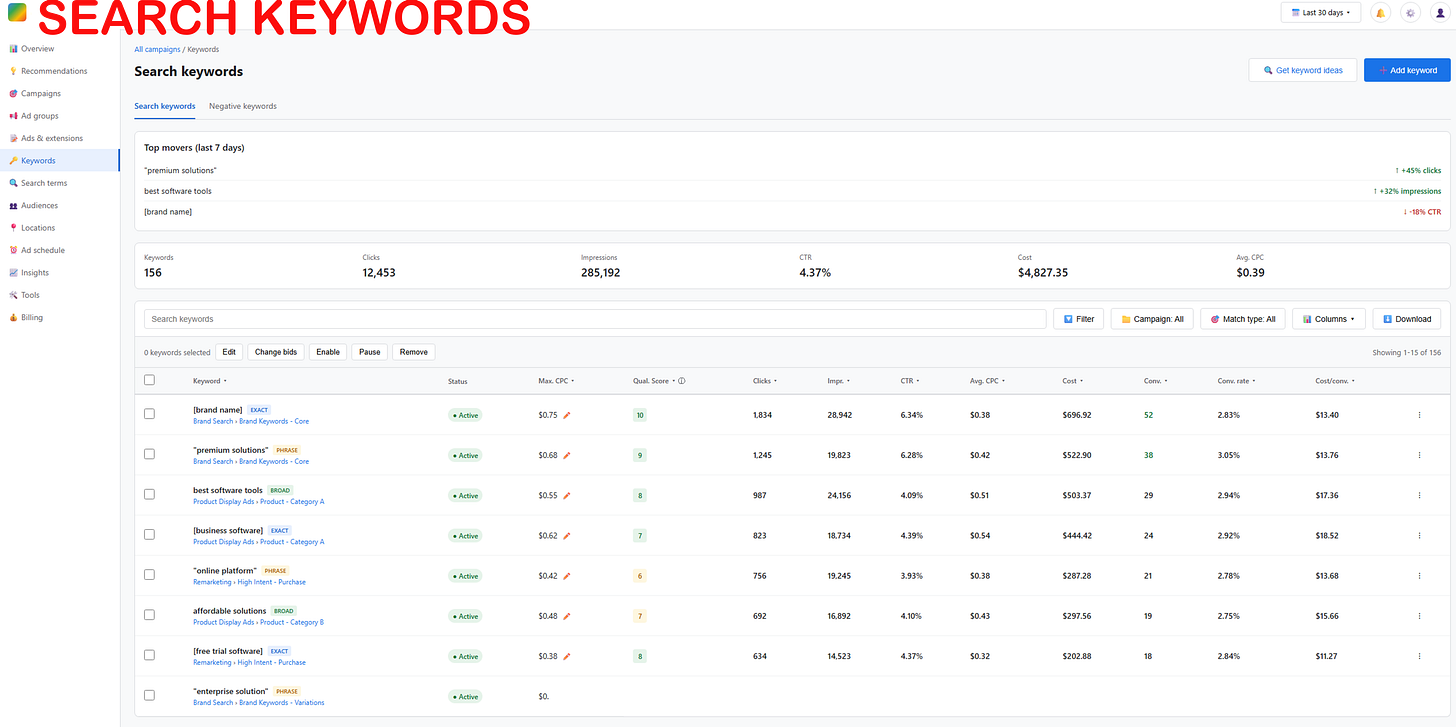 The Qual. Score column is one of the most critical yet underutilized metrics in performance marketing. Quality Score (on a 1-10 scale, with 10 being perfect) measures how relevant your ads, keywords, and landing pages are to user searches. The Brand Keywords - Core ad group with a Quality Score of 9 (green indicator) enjoys lower CPCs and better ad positions because the platform rewards relevance. Meanwhile, Competitor Terms - Brand B with a Quality Score of 4 (red indicator) faces higher costs and worse positioning. A professional performance marketer obsesses over Quality Score because improving it from 5 to 7 can reduce your CPC by 30-40% while maintaining the same ad position. You’d investigate low Quality Score ad groups by examining expected click-through rate, ad relevance, and landing page experience the three components that determine this score.