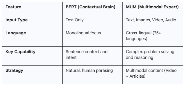 要約: 検索エンジンはNLP(自然言語処理)を用いて意図を理解します。BERTが文脈を処理する一方、MUMは複雑なマルチモーダル(テキスト/動画/画像)タスクを扱います。