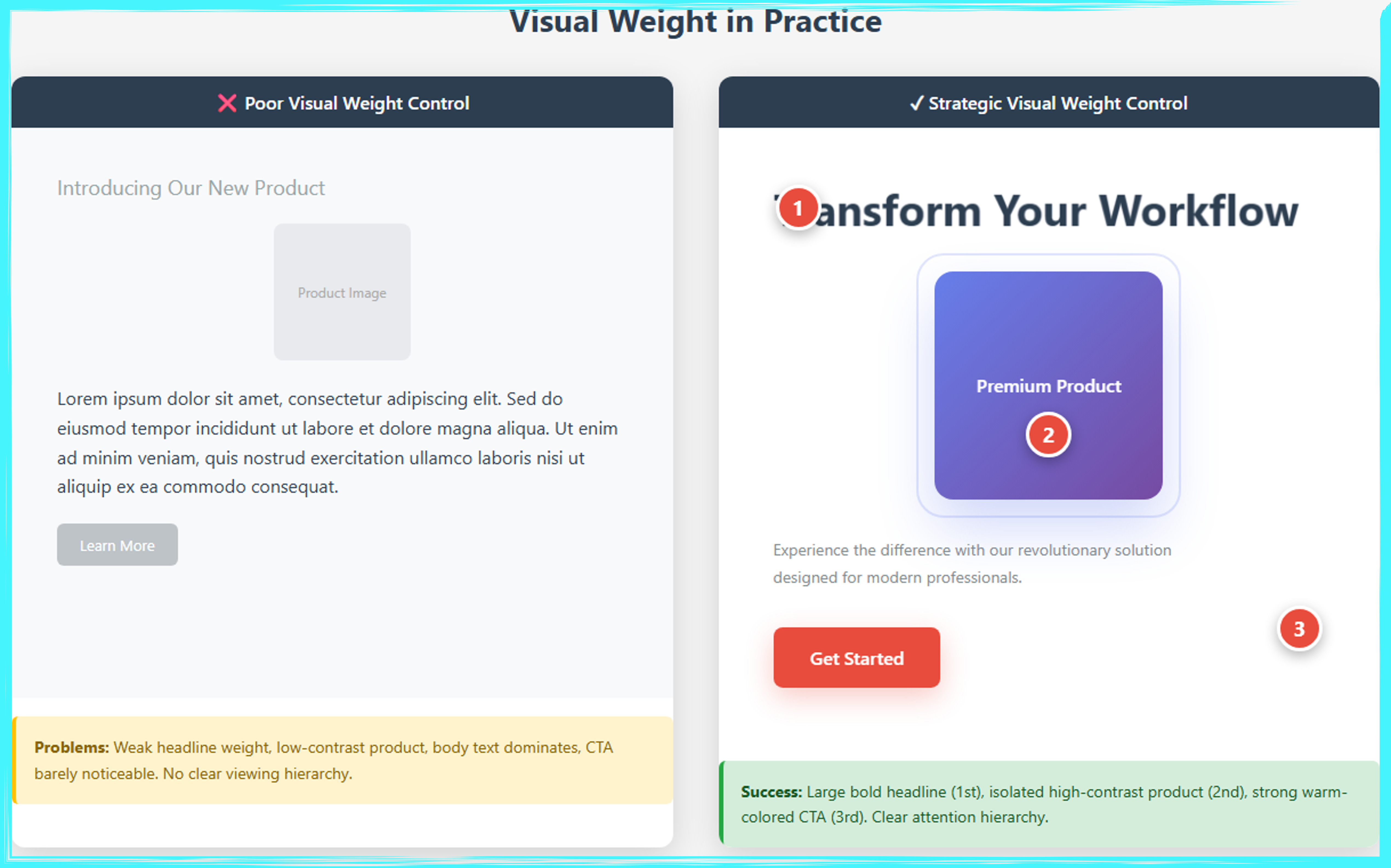 This side-by-side comparison demonstrates the critical impact of visual weight control on ad effectiveness. The left panel illustrates poor visual weight distribution, where a weak, low-contrast headline competes with dense body text, a faint product image, and an inconspicuous call-to-action button, resulting in no clear attention hierarchy and viewer confusion. The right panel showcases strategic visual weight control through three numbered focal points: a bold, large headline “Transform Your Workflow” (1st), a high-contrast, isolated premium product with generous white space (2nd), and a prominent warm-colored CTA button (3rd). This deliberate hierarchy guides viewers through the intended sequence using size differentiation, color contrast, spatial isolation, and restrained body copy, creating a clear path from awareness to action that significantly improves engagement and conversion rates.