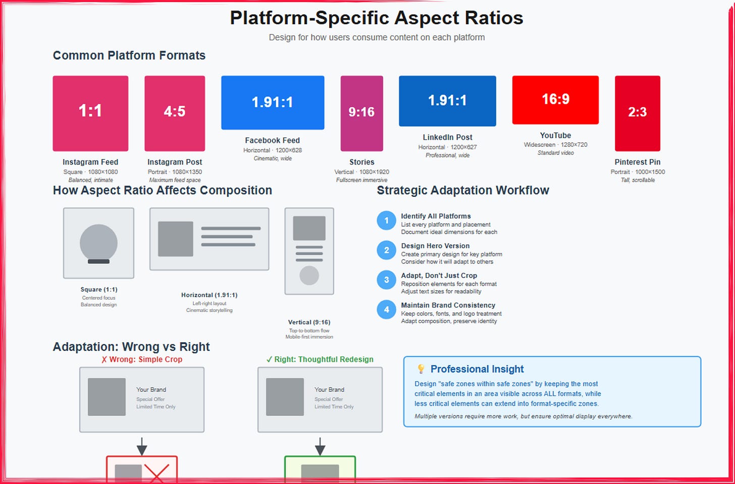 This comprehensive infographic educates designers on platform-specific aspect ratios and strategic adaptation workflows for cross-platform advertising campaigns. The Common Platform Formats section displays seven major social media specifications with color-coded rectangles showing actual proportions: Instagram Feed (1:1 square, 1080×1080), Instagram Post (4:5 portrait, 1080×1350), Facebook Feed (1.91:1 horizontal, 1200×628), Stories (9:16 vertical, 1080×1920), LinkedIn Post (1.91:1 horizontal, 1200×627), YouTube (16:9 widescreen, 1280×720), and Pinterest Pin (2:3 portrait, 1000×1500), with each labeled by orientation, dimensions, and use case. The How Aspect Ratio Affects Composition section illustrates three fundamental layout approaches: square format (1:1) favors centered focus and balanced design, horizontal format (1.91:1) enables left-right layout and cinematic storytelling, while vertical format (9:16) follows top-to-bottom flow optimized for mobile-first immersion. The Strategic Adaptation Workflow provides a four-step process using numbered blue circles: (1) identify all platforms and document ideal dimensions, (2) design a hero version for the key platform considering how it will adapt to others, (3) adapt rather than simply crop by repositioning elements for each format and adjusting text sizes for readability, and (4) maintain brand consistency by keeping colors, fonts, and logo treatment consistent while adapting composition to preserve identity. The Adaptation: Wrong vs Right comparison contrasts lazy execution against thoughtful redesign: the wrong approach (marked with red X) shows simple cropping that cuts off critical product imagery when converting from horizontal to square format, while the right approach (marked with green checkmark) demonstrates thoughtful repositioning where the product remains fully visible and text is adjusted for the new dimensions. The Professional Insight box emphasizes the “safe zones within safe zones” strategy—keeping the most critical elements in an area visible across ALL formats while allowing less critical elements to extend into format-specific zones, acknowledging that multiple versions require more work but ensure optimal display everywhere, preventing the common mistake of designing for one platform and discovering critical content gets cropped on others.