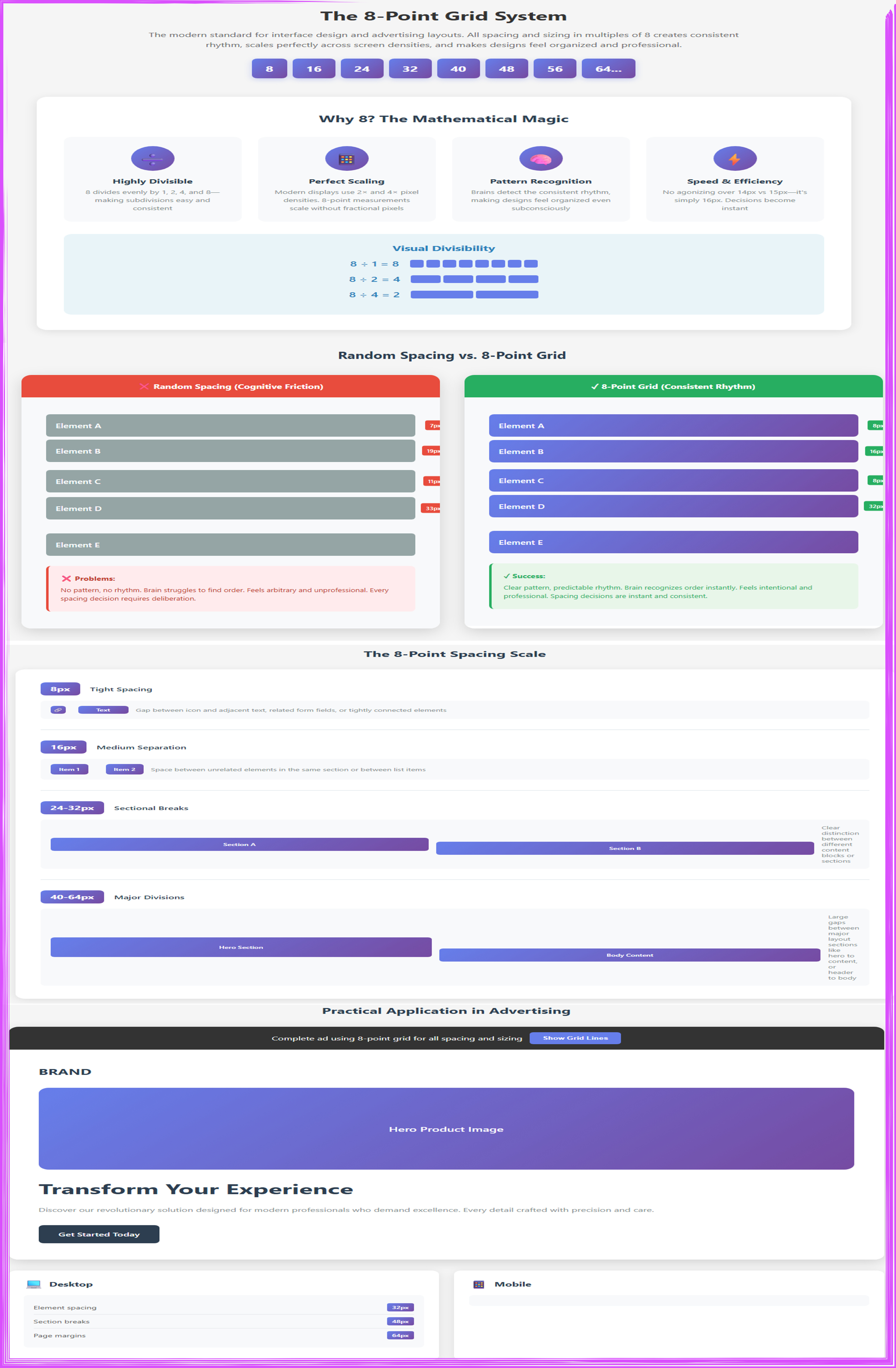 This comprehensive infographic explains the 8-point grid system the modern standard for interface design and advertising layouts where all spacing and sizing uses multiples of 8 (8, 16, 24, 32, 40, 48, 56, 64...) to create consistent rhythm, scale perfectly across screen densities, and produce organized, professional designs. The top section outlines why 8 works mathematically through four advantages: highly divisible (8 ÷ 2 ÷ 2 ÷ 2 creates easy subdivisions), perfect scaling (aligns cleanly across 1x, 2x, and 3x pixel densities for retina displays), pattern recognition (brain detects consistent rhythms subconsciously), and speed and efficiency (no mental arithmetic required 8×3 simply becomes 24px). A visual divisibility diagram demonstrates how 8 ÷ 1 = 8 boxes, 8 ÷ 2 = 4 boxes, and 8 ÷ 4 = 2 boxes for flexible layout options. The middle comparison contrasts random spacing versus 8-point grid: the left “cognitive friction” panel shows five elements with arbitrary, inconsistent gaps (marked with red X’s) that create visual chaos and require constant deliberation, while the right “consistent rhythm” panel displays the same elements with uniform 8-point spacing (marked with green checks) producing predictable patterns, easier scanning, and professional polish. The 8-Point Spacing Scale section provides practical guidelines: tight spacing (8px) for closely related items like icon-text adjacency, medium separation (16-24px) for distinct but related elements, sectional breaks (24-32px) for major content divisions with labeled examples, and major divisions (40-64px) separating hero sections from body content with comprehensive labeling. The bottom Practical Application demonstrates a complete advertisement using 8-point grids throughout, with a toggle button to show/hide grid lines, displaying proper element spacing (8px), section breaks (24px), and page margins (32px) across both desktop and mobile views proving that mathematical precision creates designs that feel organized, professional, scalable, and effortlessly harmonious.