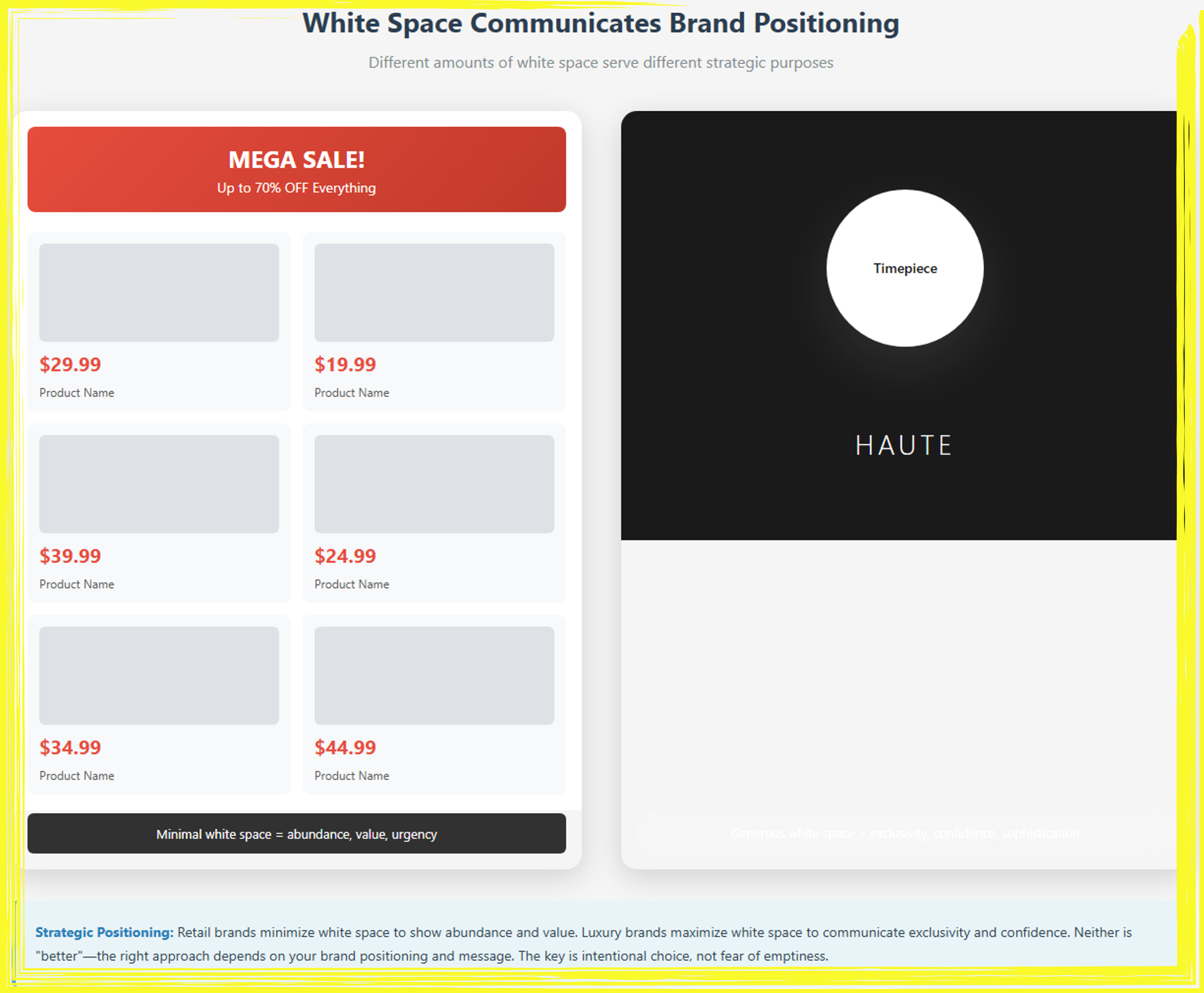 This comparison infographic demonstrates how varying amounts of white space communicate distinct brand positioning strategies and target different market segments. The left panel exemplifies a retail/value-oriented approach with minimal white space, featuring a prominent red “MEGA SALE!” banner, dense product grid displaying six items with prices ranging from $19.99 to $44.99, minimal margins between elements, and an emphasis on abundance and urgency—a design strategy that signals accessibility, value, and immediate action to price-conscious consumers seeking deals and variety. The right panel showcases a luxury positioning through maximal white space, presenting a stark black background with a single centered white circle containing “Timepiece,” the minimalist brand name “HAUTE” in elegant letterforms, and vast empty areas dominating approximately 85% of the composition—communicating exclusivity, confidence, premium quality, and refined taste to affluent consumers who associate restraint with sophistication. The bottom insight emphasizes that neither approach is inherently superior; retail brands intentionally minimize white space to convey abundance and competitive pricing, while luxury brands deliberately maximize it to project exclusivity and prestige, making the strategic choice of white space density a powerful tool for brand positioning that should align with target audience expectations, price points, and brand values rather than stemming from design uncertainty or fear of emptiness.