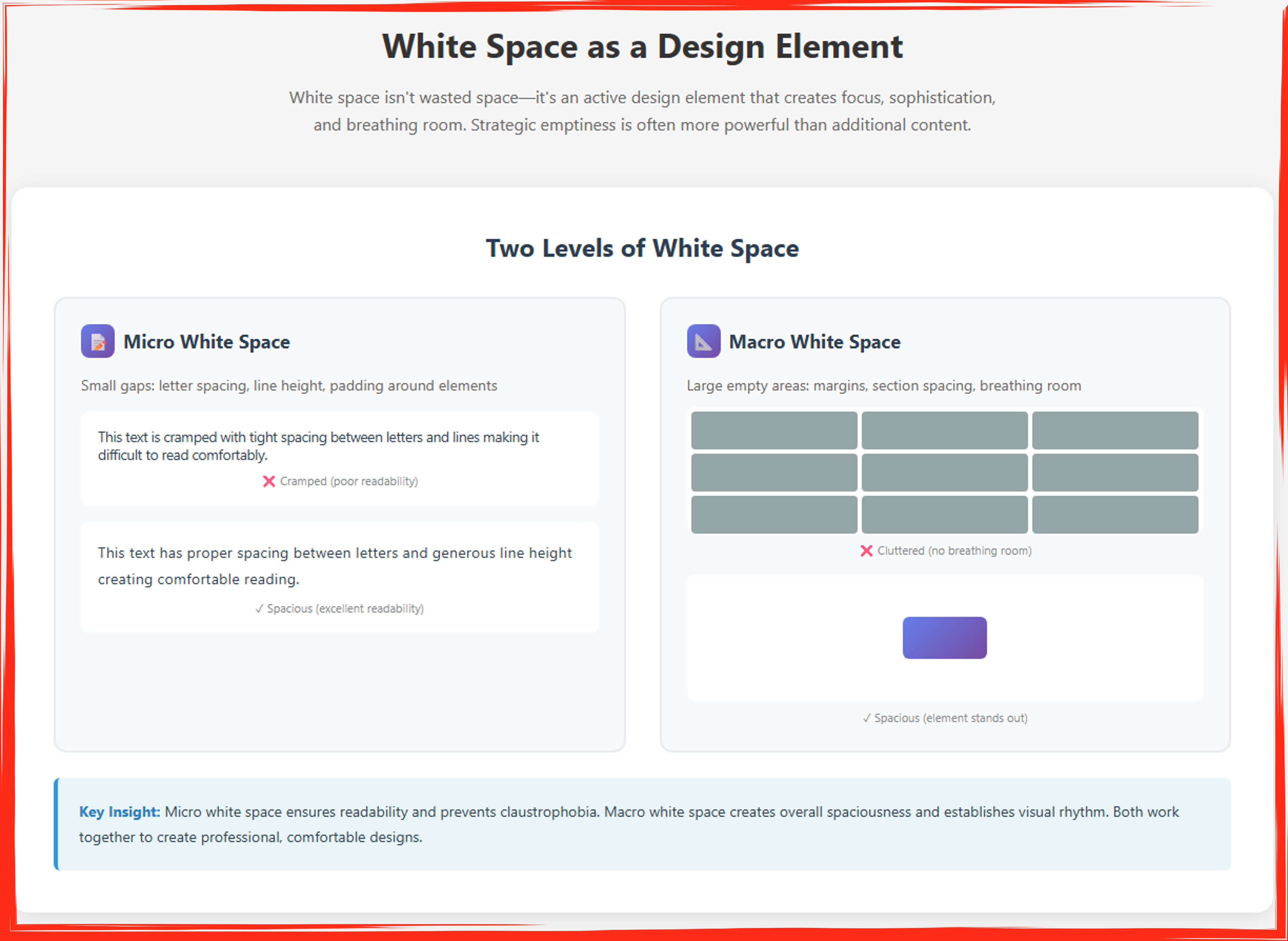 This infographic distinguishes between two essential types of white space in design and demonstrates their complementary roles in creating effective advertisements. The left panel explains micro white space—the small gaps controlling letter spacing, line height, and padding around elements—through a direct comparison showing cramped text with poor readability (marked with a red X) versus properly spaced text with generous line height that ensures comfortable reading (marked with a green checkmark). The right panel illustrates macro white space—the large empty areas including margins, section spacing, and breathing room—by contrasting a cluttered grid of nine tightly packed elements that create visual chaos (red X) against a single isolated element surrounded by ample white space that commands attention and creates sophistication (green checkmark). The bottom insight emphasizes that micro white space ensures readability and prevents claustrophobia at the detail level, while macro white space establishes overall spaciousness and visual rhythm at the compositional level, with both types working synergistically to produce professional, comfortable, and impactful designs that leverage strategic emptiness as a powerful design tool rather than wasted space.