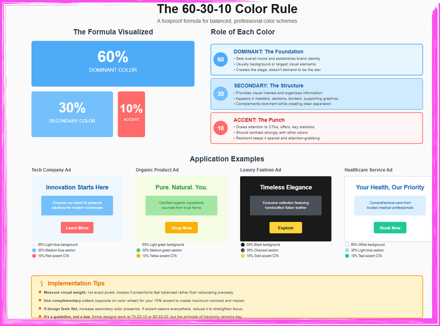 This infographic presents the 60-30-10 color rule a foolproof formula for creating balanced, professional color schemes in advertising design. The Formula Visualized section (top left) displays the proportional relationship through scaled rectangles: a large blue block representing 60% dominant color, a medium blue block showing 30% secondary color, and a small coral block indicating 10% accent color, making the hierarchy immediately clear through size differentiation. The Role of Each Color section (top right) explains the strategic function of each proportion: the 60% Dominant color (blue circle) serves as the foundation that sets overall mood and establishes brand identity, typically appearing as backgrounds or largest visual elements, creating the stage without demanding to be the star; the 30% Secondary color (lighter blue circle) provides visual interest and organizes information, appearing in headers, sections, borders, and supporting graphics, complementing the dominant color while creating clear separation and structure; the 10% Accent color (coral circle) delivers the punch by drawing attention to CTAs, offers, and key statistics, contrasting strongly with other colors while maintaining restraint to preserve its attention-grabbing power and special status. The Application Examples section demonstrates four real-world implementations: Tech Company Ad uses 60% light blue background (trust, innovation), 30% medium blue section (structured information), and 10% red accent CTA button (urgency); Organic Product Ad employs 60% light green background (natural, eco-friendly), 30% medium green section (health focus), and 10% yellow accent CTA (optimism, action); Luxury Fashion Ad leverages 60% black background (sophistication, elegance), 30% charcoal section (premium quality), and 10% gold accent CTA (luxury, exclusivity); Healthcare Service Ad utilizes 60% white background (cleanliness, trust), 30% light blue section (calm, professionalism), and 10% teal accent CTA (wellness, action). The Implementation Tips box (bottom) provides practical guidance with four key points: measure visual weight rather than exact pixels by assessing if proportions feel balanced rather than calculating precisely; use complementary colors (opposite on the color wheel) for the 10% accent to create maximum contrast and impact; if design feels flat, increase secondary color presence, or if accent seems everywhere, reduce it to strengthen focus; and emphasizes that it’s a guideline, not a law some designs work at 70-20-10 or 50-30-20, but the principle of establishing clear visual hierarchy through proportional color distribution remains key to preventing chaotic, unprofessional color schemes where every element competes equally for attention.