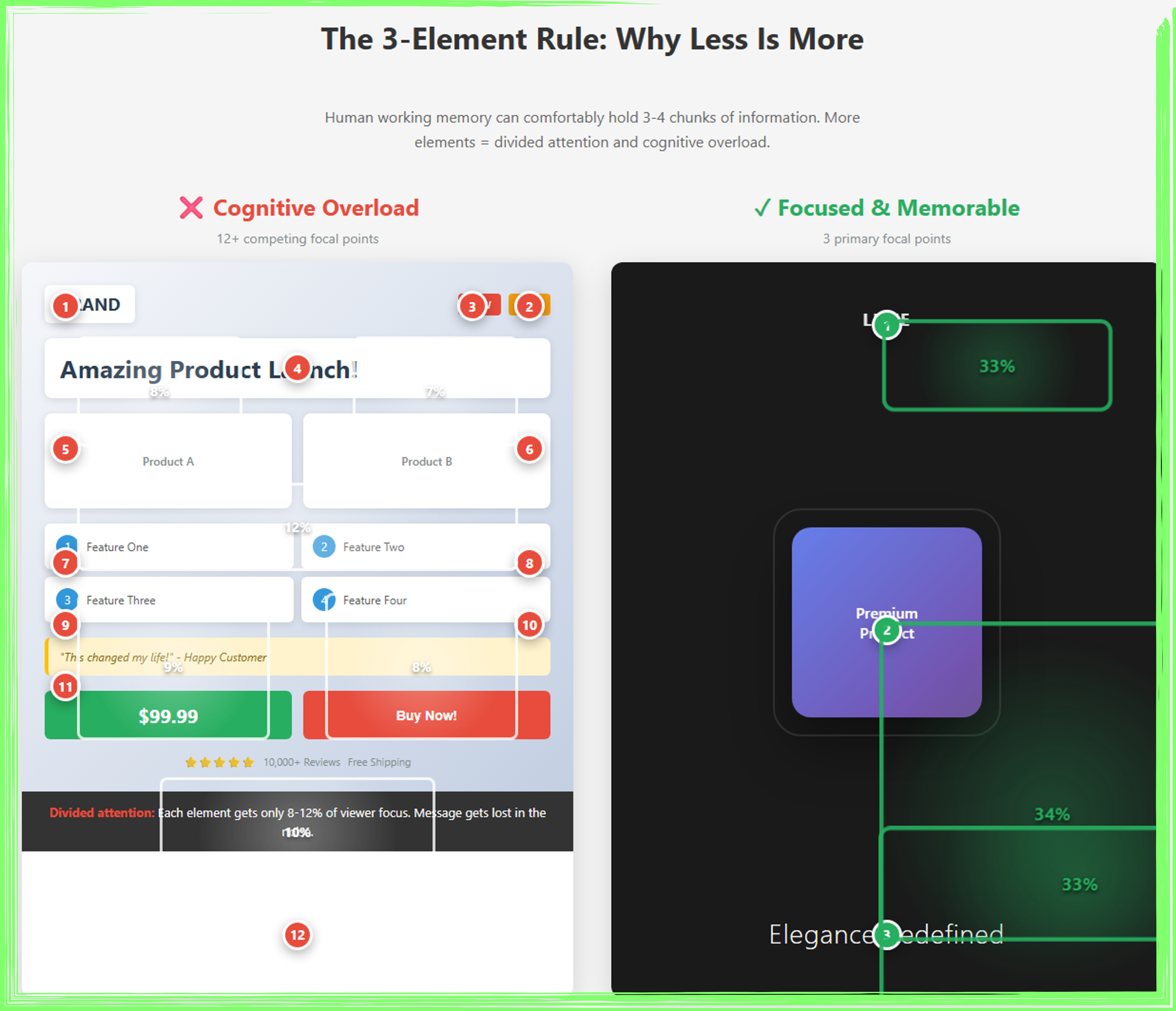 This infographic illustrates the 3-Element Rule in ad design by comparing cognitive overload versus focused visual hierarchy. The left panel demonstrates how advertisements with 12+ competing elements (numbered 1-12 in red) fragment viewer attention, resulting in each component receiving only 8-12% of focus—causing the core message to become lost in visual clutter. In contrast, the right panel showcases a streamlined design with just three primary focal points (numbered 1-3 in green): the logo, premium product, and tagline. This minimalist approach allocates 33% of viewer attention to each element, creating a clear visual hierarchy that enhances memorability and impact. The comparison reveals how human working memory’s limitation of holding 3-4 chunks of information directly translates to effective ad design—demonstrating that strategic restraint and generous white space produce more sophisticated, memorable, and persuasive advertisements than busy, element-heavy layouts.