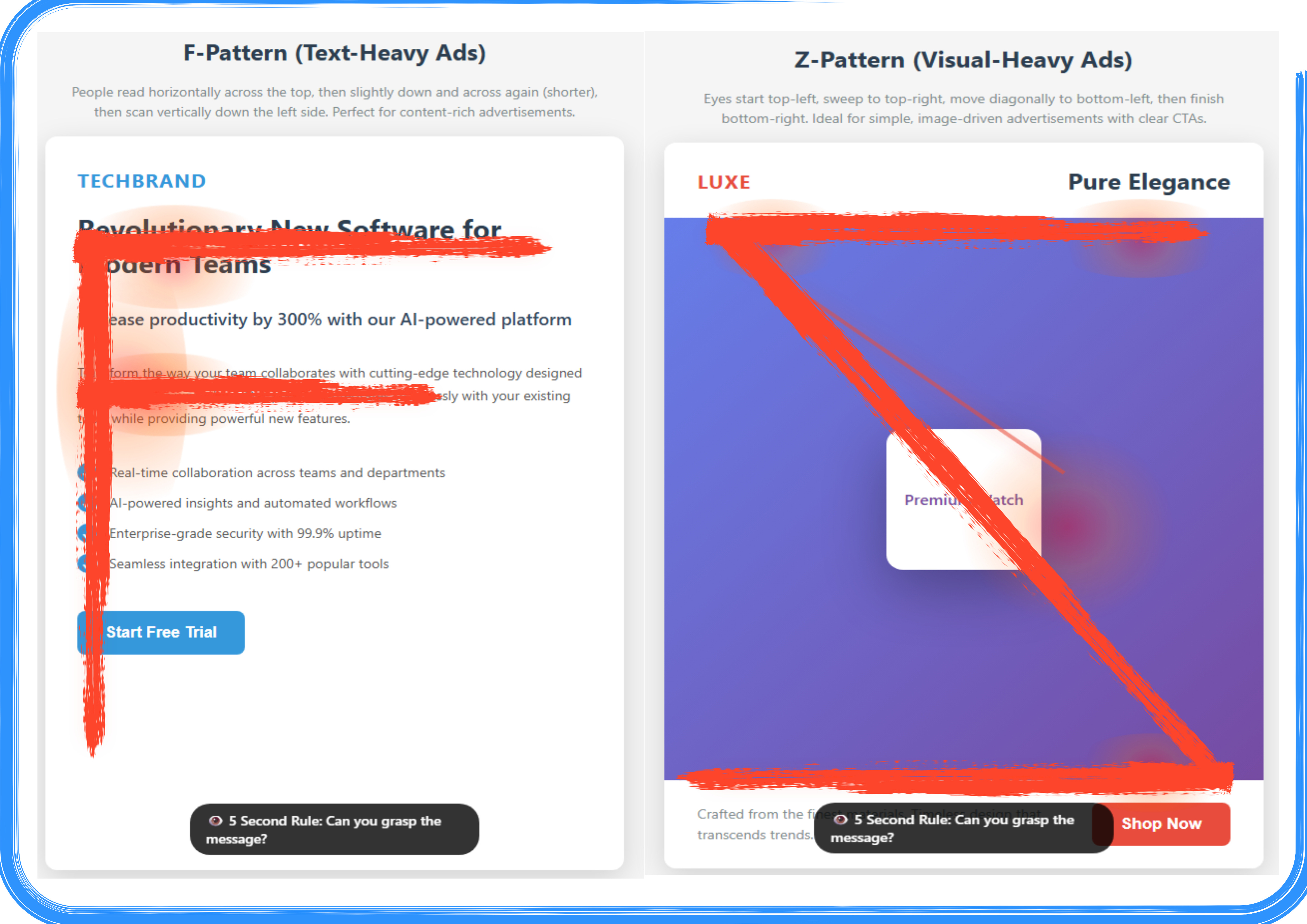 Comparison of eye-tracking patterns for text-heavy versus visual-heavy advertising designs, illustrated with red overlay paths indicating viewer gaze movement. The left panel demonstrates the F-Pattern reading behavior for text-heavy advertisements, showing a TechBrand software ad with the eye-tracking path (red overlay) starting at the top-left brand name, moving horizontally across the headline “Revolutionary New Software for Modern Teams,” dropping slightly down to scan horizontally across the subheadline about “300% productivity,” then scanning vertically down the left margin through the bulleted feature list, and terminating at the “Start Free Trial” call-to-action button, creating an F-shaped pattern optimal for content-rich advertisements where viewers seek detailed information. The right panel illustrates the Z-Pattern viewing behavior for visual-heavy advertisements, showing a LUXE brand luxury product ad with the eye-tracking path (red overlay) beginning at the top-left “LUXE” logo, sweeping horizontally across to “Pure Elegance” in the top-right corner, then moving diagonally downward across the purple gradient background to the centered “Premium Watch” product card, and finishing with a horizontal sweep along the bottom from the descriptive text to the red “Shop Now” button in the bottom-right, forming a Z-shaped pattern ideal for simple, image-driven advertisements with minimal text and clear visual hierarchy that guides viewers efficiently to the call-to-action.