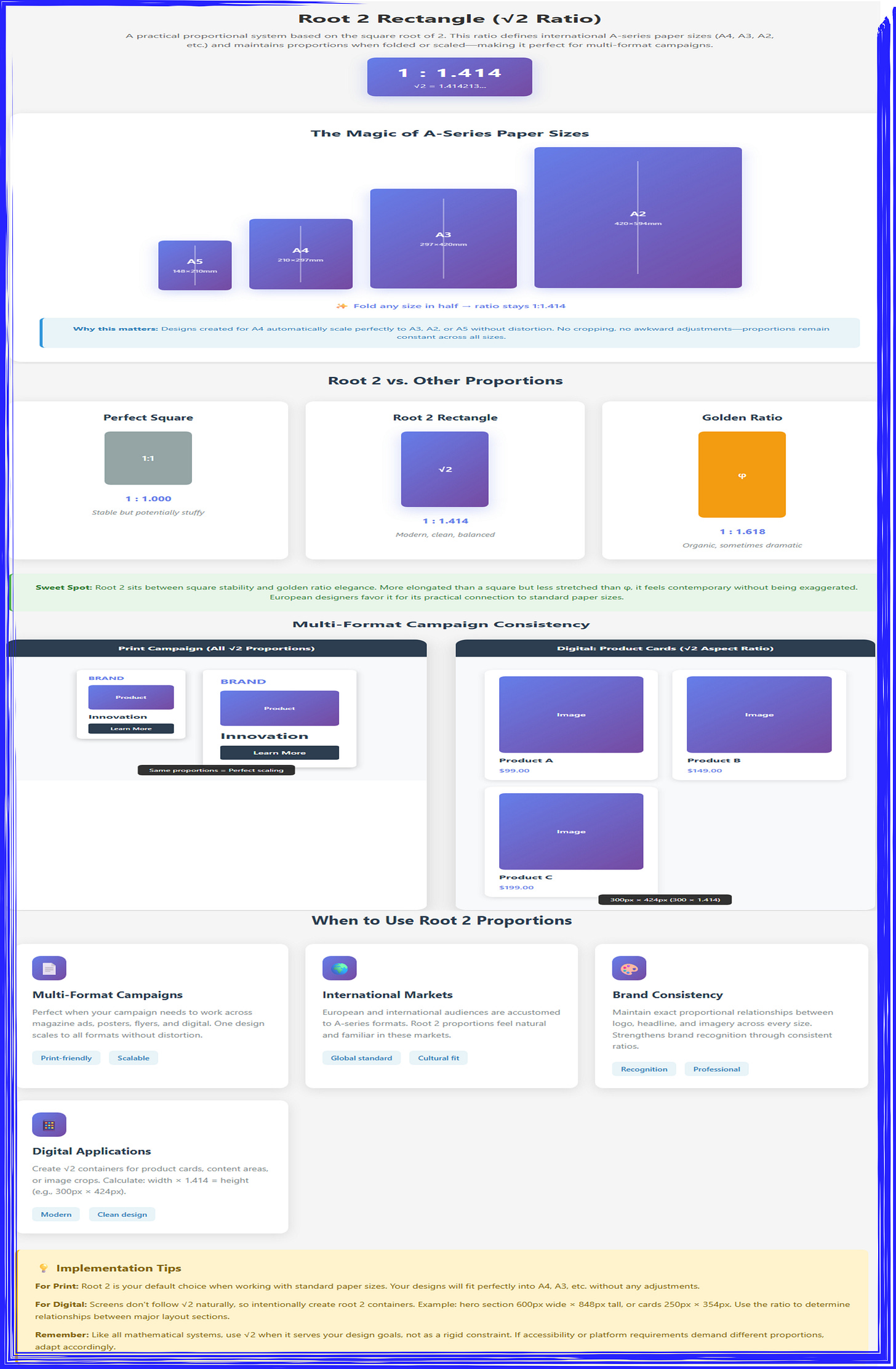 This demonstration illustrates the root 2 proportional system, defined by the ratio 1:1.414, which forms the basis of international A-series paper sizes. The animated paper demo shows A5 through A2 sheets with floating animations and vertical fold indicators, demonstrating the “magic” property where folding any size in half maintains the constant √2 ratio—ensuring designs scale perfectly across formats without distortion or cropping. The ratio comparison visualizes three proportional systems side-by-side: the perfect square (1:1, stable but potentially stuffy in gray), the root 2 rectangle (1:1.414, modern and balanced in purple gradient, positioned as the “sweet spot”), and the golden ratio (1:1.618, organic and dramatic in orange). Multi-format application demos show practical implementation through a print campaign (magazine ad and poster maintaining identical proportional relationships when scaled) and digital product cards (e-commerce grid using 300px × 424px cards calculated as width × 1.414). Four use case cards highlight optimal scenarios: multi-format campaigns (print-friendly and scalable), international markets (global A-series standard with cultural familiarity), brand consistency (maintaining exact proportional relationships across sizes for recognition), and digital applications (creating modern, clean √2 containers for content areas and cards). The implementation tips box provides practical guidance for both print (default choice for standard paper sizes) and digital (intentionally creating root 2 containers like 600px × 848px hero sections), while reminding designers to adapt the system when accessibility or platform requirements demand flexibility rather than treating it as a rigid constraint.