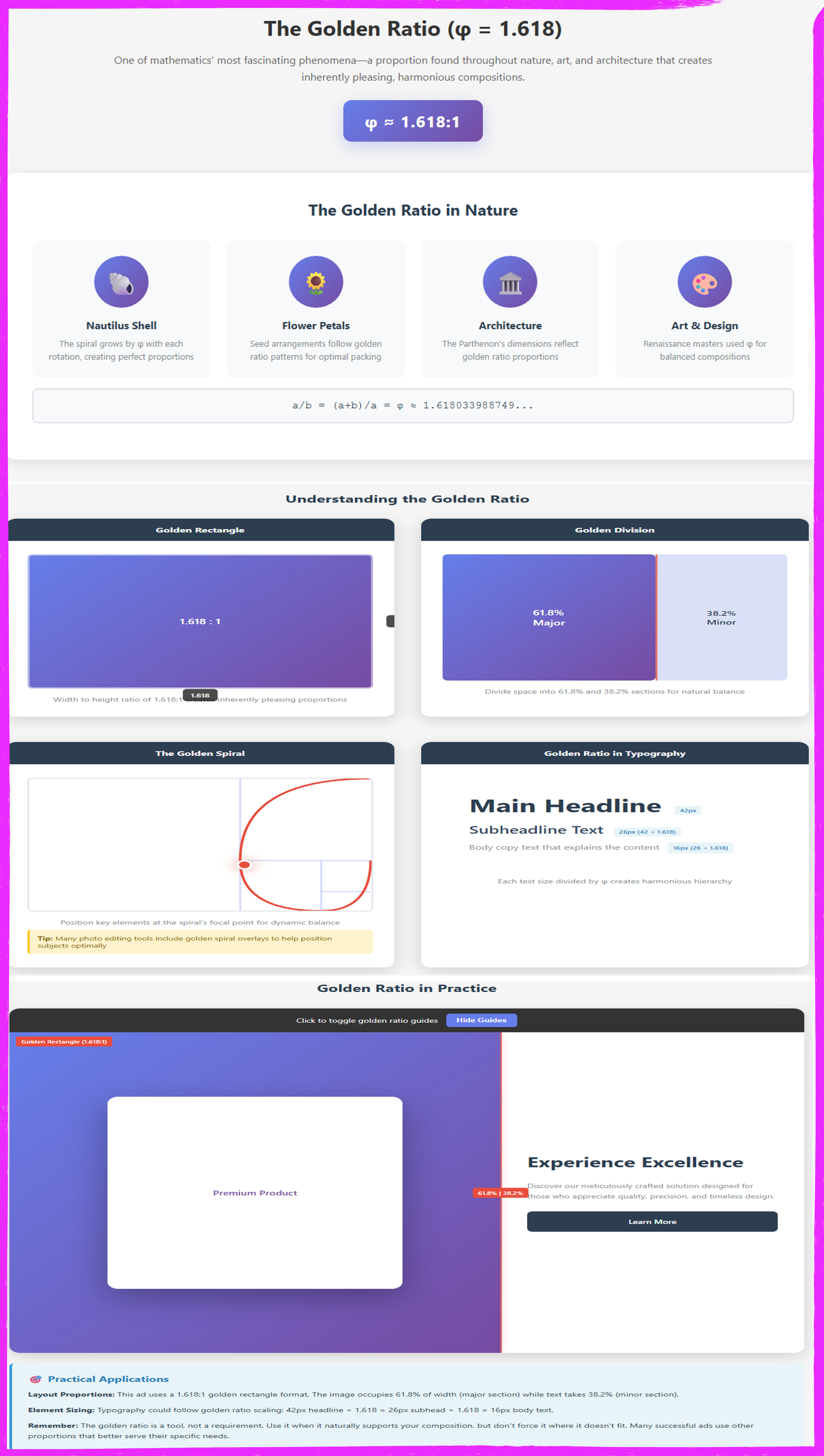 This comprehensive infographic educates designers on the golden ratio (φ = 1.618) and its practical application in advertisement design. The header introduces the divine proportion as a mathematically derived relationship found throughout nature, art, and architecture that creates inherently pleasing, harmonious compositions. The top section presents four real-world examples nautilus shell spirals that grow by φ with each rotation, flower petal arrangements following golden ratio patterns for optimal packing, the Parthenon’s architectural dimensions reflecting these proportions, and Renaissance masters’ use of φ for balanced compositions accompanied by the mathematical formula demonstrating the relationship. The middle section provides two fundamental visualizations: the Golden Rectangle showing width-to-height ratio of 1.618:1 with clear dimension labels, and the Golden Division demonstrating how to split space into 61.8% (major) and 38.2% (minor) sections for natural balance. Advanced concepts include the Golden Spiral with animated SVG drawing showing how positioning key elements at the spiral’s focal point creates dynamic balance, plus a practical Typography Scale demonstrating harmonious font sizing (42px headline ÷ 1.618 = 26px subhead ÷ 1.618 = 16px body copy). The bottom Golden Ratio in Practice section features an interactive full advertisement layout in 1.618:1 format with toggle-able guide overlays, showing a premium product occupying 61.8% of width (major section) and “Experience Excellence” text in the 38.2% section (minor section), with a practical applications note emphasizing that while the golden ratio naturally supports pleasing composition, designers shouldn’t force it where other proportions better serve their specific needs making φ a powerful compositional tool rather than a rigid requirement.