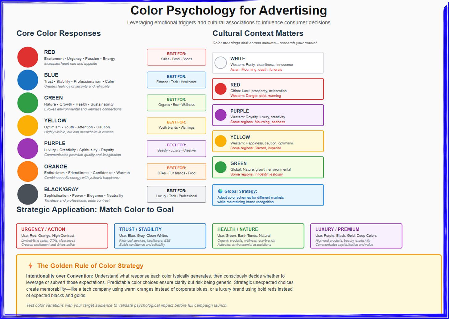 This comprehensive infographic educates advertisers on color psychology principles and strategic color selection for maximum campaign effectiveness. The Core Color Responses section (left) catalogs seven fundamental colors with their psychological triggers and recommended applications: Red (excitement, urgency, passion, energy—increases heart rate and appetite, best for sales, food, and sports), Blue (trust, stability, professionalism, calm—creates feelings of security and reliability, best for finance, tech, and healthcare), Green (nature, growth, health, sustainability—evokes environmental and wellness connections, best for organic, eco, and wellness brands), Yellow (optimism, youth, attention, caution—highly visible but can overwhelm in excess, best for youth brands and warnings), Purple (luxury, creativity, spirituality, royalty—communicates premium quality and imagination, best for beauty, luxury, and creative industries), Orange (enthusiasm, friendliness, confidence, warmth—combines red’s energy with yellow’s happiness, best for CTAs, fun brands, and food), and Black/Gray (sophistication, power, elegance, neutrality—timeless and professional, adds contrast, best for luxury, tech, and professional services). The Cultural Context Matters section (right) warns that color meanings shift dramatically across cultures, providing critical examples: White means purity and cleanliness in Western contexts but represents mourning, death, and funerals in Asian cultures; Red signifies luck, prosperity, and celebration in China but danger, debt, and warning in Western contexts; Purple conveys royalty, luxury, and creativity in the West but mourning and sadness in some regions; Yellow represents happiness, caution, and optimism in the West but is considered sacred and imperial in some regions; Green globally signals nature, growth, and environmental values but indicates infidelity or jealousy in some regions. The Strategic Application: Match Color to Goal section provides four scenario-based recommendations: for Urgency/Action campaigns (limited-time sales, CTAs, clearances), use red, orange, and high contrast to create excitement and drive action; for Trust/Stability messaging (financial services, healthcare, B2B), use blue, gray, and clean whites to build confidence and reliability; for Health/Nature positioning (organic products, wellness, eco-friendly), use green, earth tones, and natural palettes to activate environmental associations; for Luxury/Premium branding (high-end products, beauty, exclusivity), use purple, black, gold, and deep colors to communicate sophistication and value. The bottom Golden Rule of Color Strategy emphasizes intentionality over convention: understand what response each color typically generates, then consciously decide whether to leverage or subvert those expectations—predictable color choices ensure clarity but risk being generic, while strategic unexpected choices create memorability, such as a tech company using warm oranges instead of corporate blues, or a luxury brand using bold reds instead of expected blacks and golds. The final guidance recommends testing color variations with target audiences to validate psychological impact before full campaign launch, ensuring colors resonate appropriately across different cultural contexts and demographic segments.
