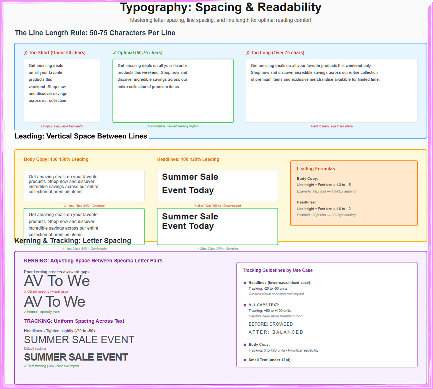 Leading: Body text 130-150%, headlines 100-120% of font size