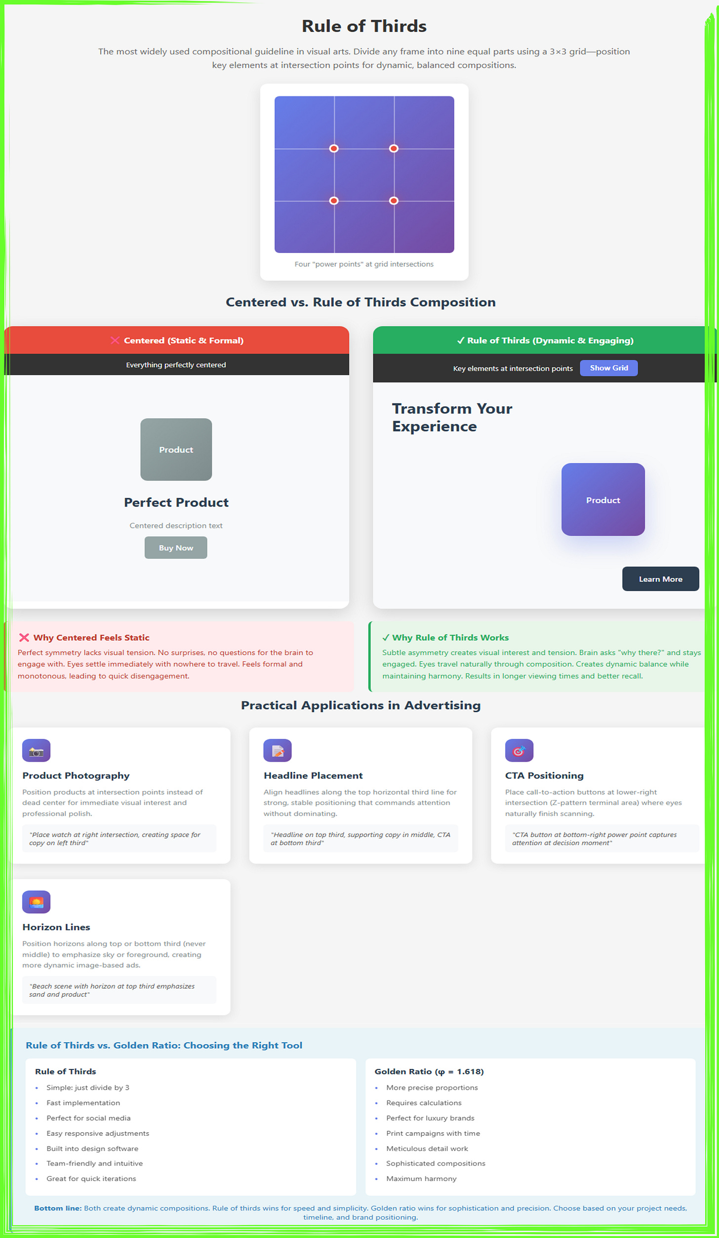 This interactive demonstration illustrates the rule of thirds compositional principle, which divides any frame into nine equal sections using a 3×3 grid. The header shows the basic grid structure with four pulsing red “power points” at line intersections where key elements should be positioned. The side-by-side comparison contrasts a static centered composition (left, using dull grays with all elements on the central axis) against a dynamic rule-of-thirds layout (right, with headline on the top third, product at the upper-right intersection, and CTA at the lower-right terminal point). Color-coded feedback boxes explain why centered compositions feel monotonous while off-center positioning creates engaging visual tension that increases viewing time. Four practical application cards demonstrate optimal positioning for product photography, headlines, CTAs, and horizon lines. The comparison table highlights when to use rule of thirds (simple, fast, ideal for social media and responsive design with built-in software support) versus golden ratio (precise, sophisticated, better for luxury brands and meticulous print campaigns). The interactive grid toggle reveals optimal placement strategies, showing how the rule of thirds provides an intuitive, quickly-implemented alternative to golden ratio calculations while still creating dynamic, balanced compositions that guide viewer attention through intentional asymmetry.