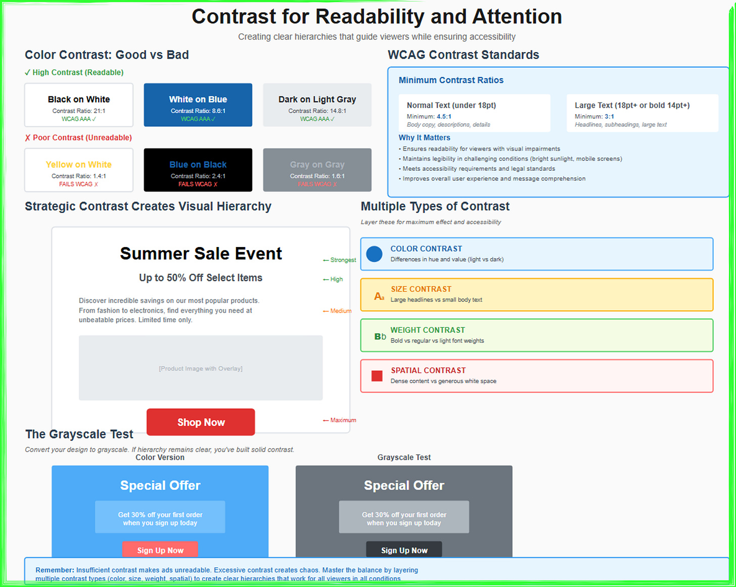 Size, weight, and spatial contrast work alongside color contrast to create comprehensive visual hierarchies. A large, bold headline creates contrast with smaller, regular-weight body text not through color but through scale and weight. Tight letter spacing in headlines contrasts with generous line spacing in body copy. Dense sections of content contrast with generous white space. These non-color contrasts prove especially important for accessible design, as they ensure hierarchy remains clear even for viewers with color blindness. The most effective ads layer multiple types of contrast: size, weight, color, and spatial contrast all working together to create unmistakable hierarchies. Test your designs by converting them to grayscale if the hierarchy still works without color, you’ve built solid contrast structure. If elements become indistinguishable in grayscale, you’re relying too heavily on color alone and need to strengthen other contrast types to ensure accessibility and clarity across all viewing conditions.