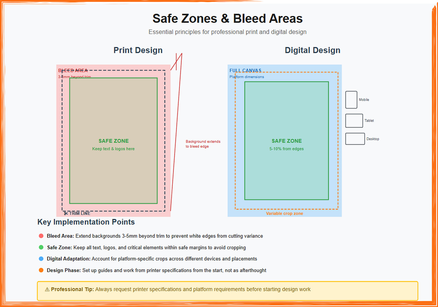 This educational infographic compares safe zones and bleed areas across print and digital advertising design, illustrating essential technical principles that prevent costly production errors. The Print Design panel (left) demonstrates the three-zone system critical for professional print production: the bleed area (red shaded region) extends 3-5mm beyond the final dimensions to prevent white edges from appearing due to cutting variance during the trimming process, the trim line (black dashed border) marks where the printed piece will be physically cut, and the safe zone (green shaded area) indicates where all text, logos, and critical elements must be positioned to avoid accidental cropping with backgrounds intentionally extending to the bleed edge while important content stays within safe margins. The Digital Design panel (right) adapts these concepts for screen-based platforms: the full canvas (blue shaded area with orange dashed border) represents platform-specified dimensions, the variable crop zone (orange dashed boundary) shows where different devices, aspect ratios, and social media placements may crop the image differently across mobile, tablet, and desktop displays, and the safe zone (green shaded area, typically 5-10% from all edges) marks where critical elements should be positioned to ensure visibility across all contexts and avoid platform-specific cropping. The bottom Key Implementation Points section provides four color-coded principles: extend backgrounds into bleed areas (red), keep essential content within safe zones (green), account for platform-specific crops across devices (blue), and establish guides from printer/platform specifications at the project’s start rather than as an afterthought (orange). The yellow warning box emphasizes the professional tip to always request printer specifications and platform requirements before beginning design work, preventing expensive reprints or content loss from improper zone management making this technical knowledge essential for designers creating advertisements destined for both physical printing and digital distribution.