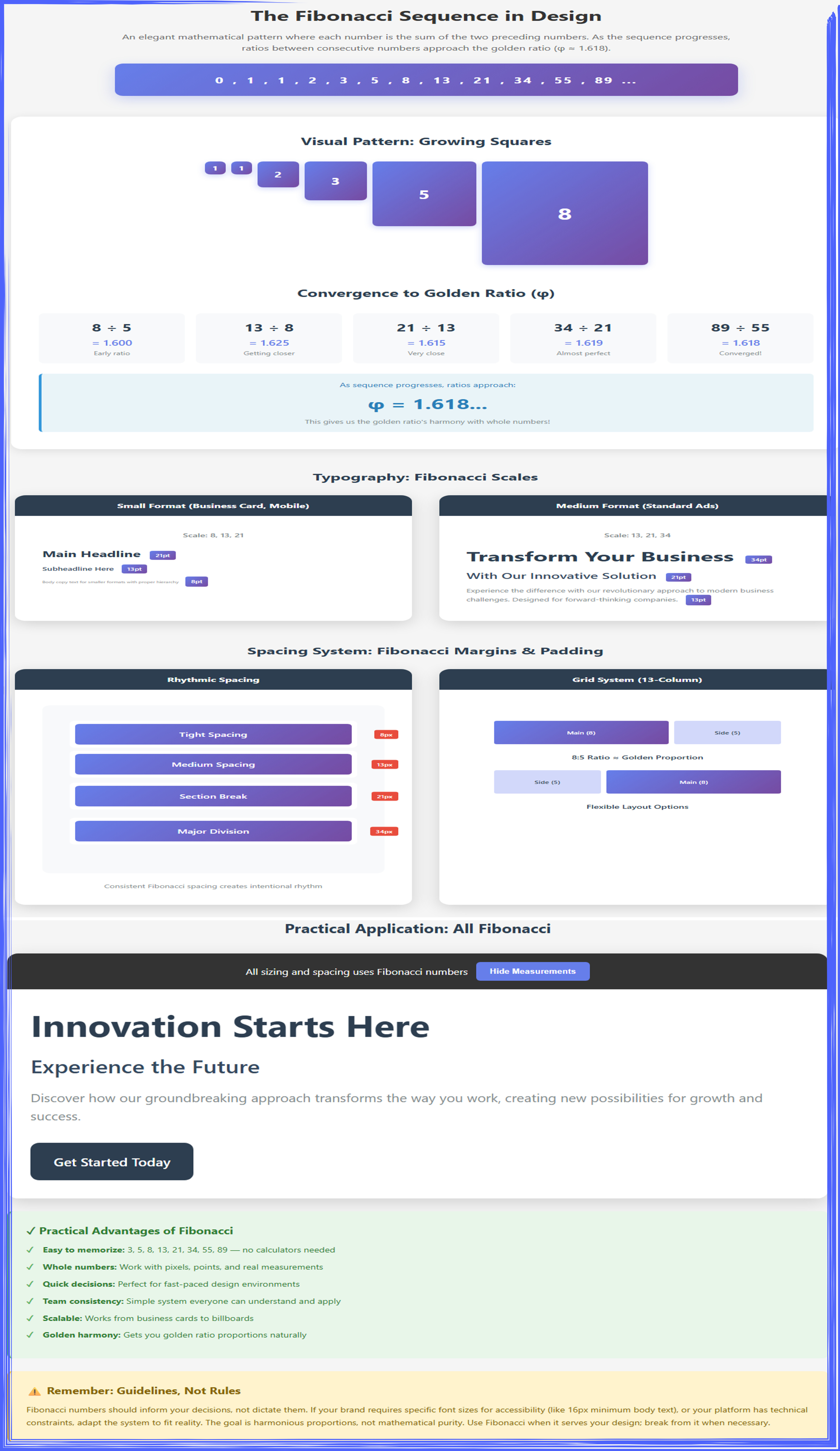Fibonacci Sequence: 3, 5, 8, 13, 21, 34, 55, 89 (use for typography sizing, spacing)