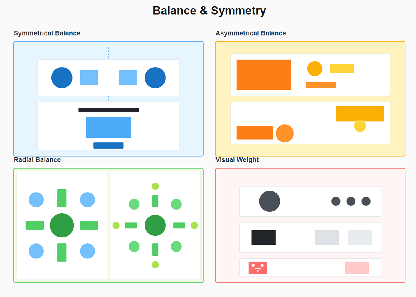 Color and contrast dramatically affect visual weight. Warm colors like red, orange, and yellow advance toward the viewer and carry more weight than cool colors like blue and green, which recede. High-contrast elements, where there’s a strong difference between the element and its background, carry more weight than low-contrast elements. This is why call-to-action buttons typically use bright, contrasting colors, they need maximum visual weight to draw the eye and prompt action. Black and white imagery can actually carry more weight than full color in certain contexts because the high contrast makes it stand out against typical colorful surroundings.